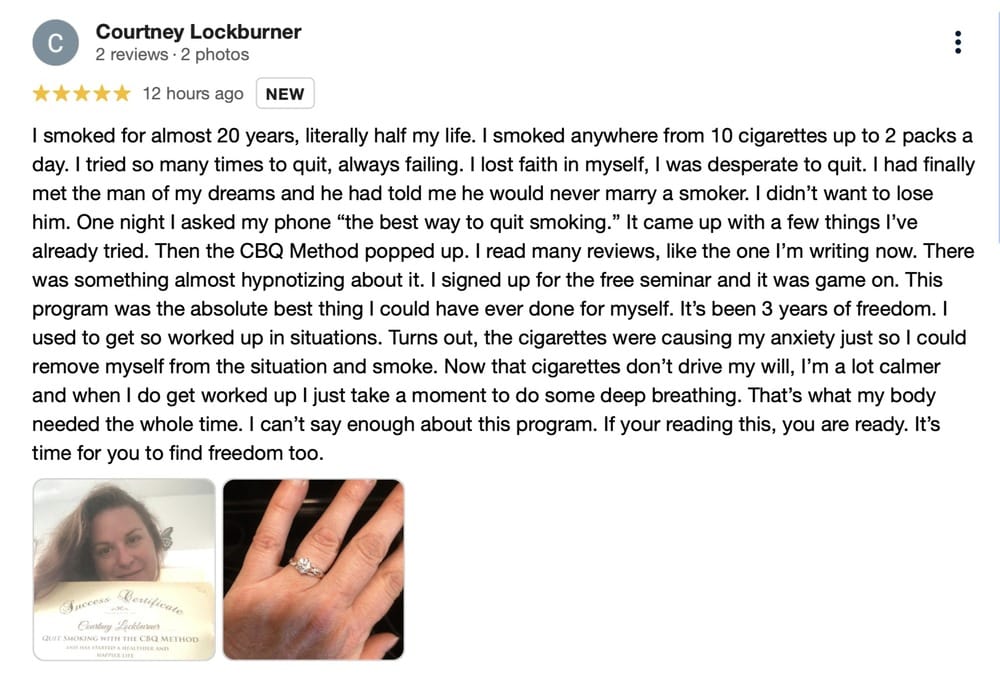 This week, CBQ Program member Courtney Lockburner from New Jersey, US, is celebrating 3 years smoke-free!! After many failed attempts, Courtney decided to commit to the CBQ Program completely. She entered the process with an open mind, chose to believe in herself, and above all, prioritized her quit smoking effort. In her own words “Give yourself the dedicated time for the program. You deserve that.”