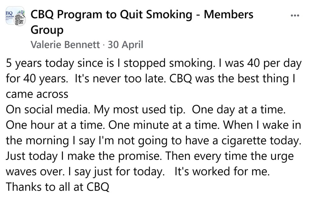 One day, while browsing Facebook, Val came across the CBQ Method and, after lots of research, decided to join the CBQ program. She quit “cold turkey” during the CBQ Quit Smoking Program because she just didn’t want to smoke anymore and has not looked back ever since. In her own words, “I am so proud of this achievement – from being in a place where I thought it would be impossible to now being able to wake up knowing I am now a nonsmoker and can do so much more with my life and feel so much better.”