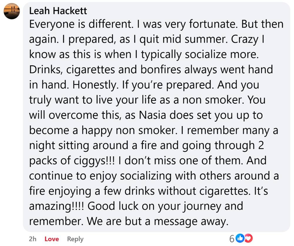 2 years after her quit date, Leah is still a happy non-smoker and has not missed cigarettes – not even when socializing!