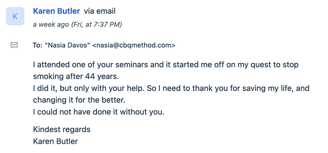 Nasia Davos (MBPsS, IPPA, BSc, MA) used to smoke, and she tried every method available, but nothing worked for her. That’s why she created the CBQ Method™. Nasia is an author, TEDx speaker, Licensed Master NLP Practitioner with a BSc in Psychology and an MA in Psychoanalysis. She is a Certified NLP Life Coach, Smoking Cessation Practitioner Certified by NSCST, graduate member of the British Psychological Society, and member of the Red Cross. Her extensive research on smoking cessation formed the CBQ Method that has helped hundreds of thousands of smokers become happy non-smokers.