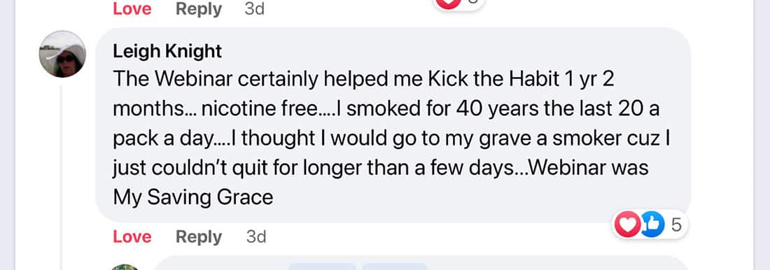 Leigh Knight credits the webinar for helping her quit smoking after 40 years.