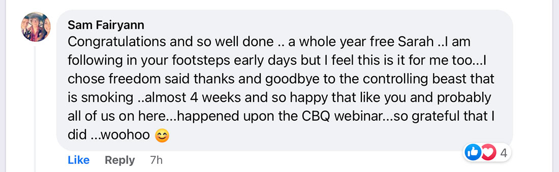 Sam from the UK is grateful for finding the CBQ webinar and is now smoke-free.