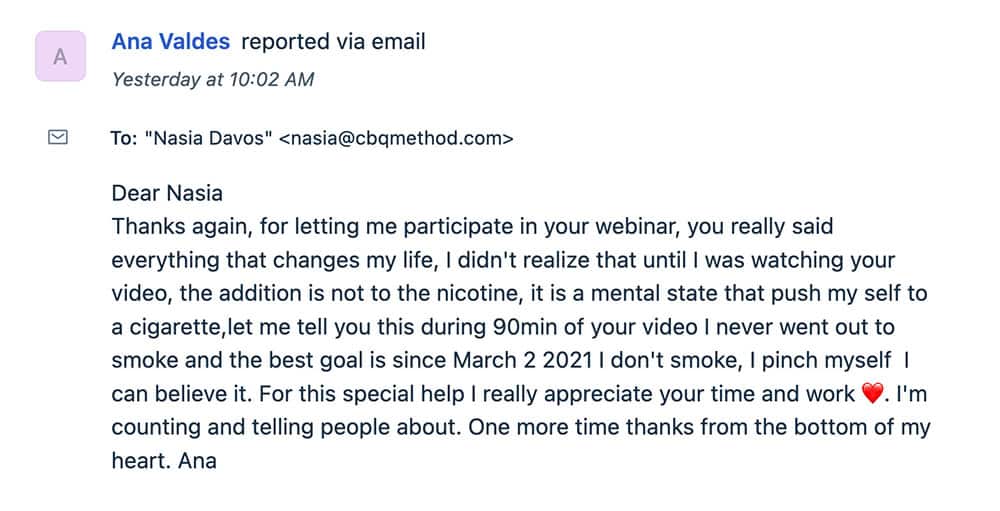 Whether you choose to apply the CBQ Method by yourself or with our paid program, I am committed to making sure you benefit tons from the free webinar. This webinar can change everything for you because you will discover the new way to quit smoking easily, and as I mentioned earlier, there are no strings attached.