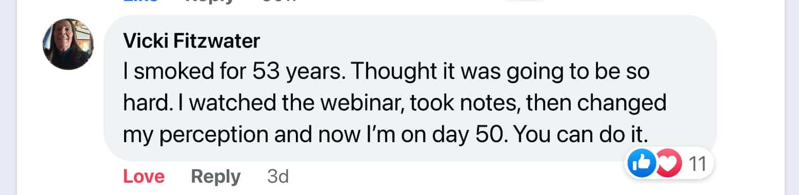 Vicki thought quitting would be hard after 53 years of smoking, but after applying what she learned on the webinar she succeeded!