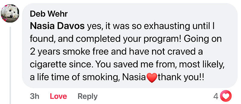 My name is Nasia Davos. I’m a psychologist, author, certified life coach, and certified smoking cessation coach.