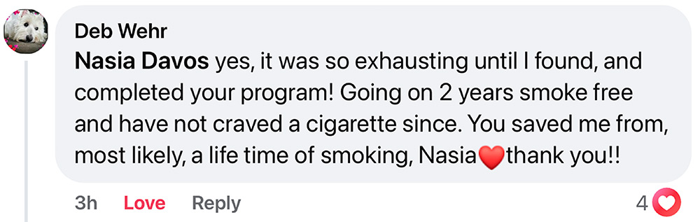 Nasia Davos (MBPsS, IPPA, BSc, MA) used to smoke, and she tried every method available, but nothing worked for her. That’s why she created the CBQ Method™. Nasia is an author, TEDx speaker, Licensed Master NLP Practitioner with a BSc in Psychology and an MA in Psychoanalysis. She is a Certified NLP Life Coach, Smoking Cessation Practitioner Certified by NSCST, graduate member of the British Psychological Society, and member of the Red Cross. Her extensive research on smoking cessation formed the CBQ Method that has helped hundreds of thousands of smokers become happy non-smokers.